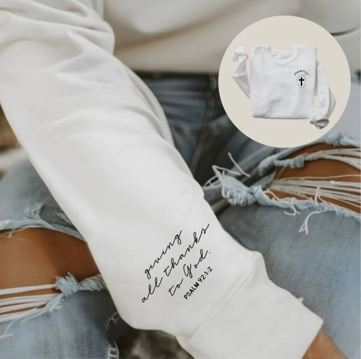 A gentle reminder to live in gratitude- “Giving all thanks to God” (Psalm 92:1–2). This pullover combines comfort with quiet faith, featuring a minimalist sleeve design that keeps the message close to your heart (and your sleeve). Crafted in a soft cotton-blend fabric, it’s perfect for everyday wear, reflection days, or cozy evenings spent in His presence.
